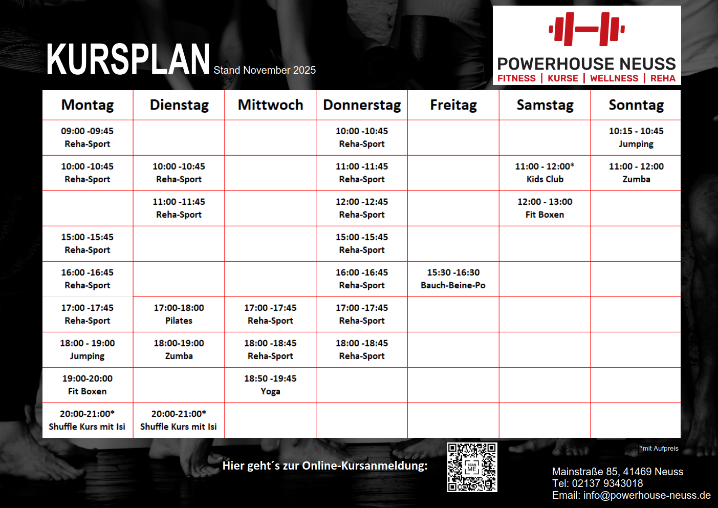Ob individuelles Training oder Sport in der Gemeinschaft bei einem unserer Kurse – beim Powerhouse Neuss hast Du alle Optionen für ein Training, das Spaß macht. Unser Kursplan ist äußerst abwechslungsreich gestaltet und wird ständig den Wünschen und Bedürfnissen unserer Mitglieder angepasst. Kondition, Koordination, Kräftigung, Straffung und Entspannung werden in allen unseren Kursen trainiert. Unser Kursraum bietet eine angenehme Atmosphäre für Sport in der Gruppe und genügend Platz, um die Trainingsziele aller Teilnehmer zu verwirklichen.